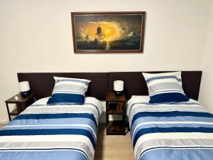 Zakwaterowanie obejmuje cztery łóżka rozmieszczone w dwóch oddzielnych sypialniach oraz rozkładaną sofę w części dziennej. W pełni wyposażony aneks kuchenny zapewnia nowoczesne udogodnienia takie jak płyta grzewcza, piekarnik, zmywarka do naczyń, lodówka, mikrofalówka i ekspres do kawy wraz ze sprzętem do parzenia herbaty i kawy. Łazienka posiada zarówno prysznic typu walk-in bez progu, jak i dodatkową wannę lub możliwość skorzystania z drugiego prysznica.