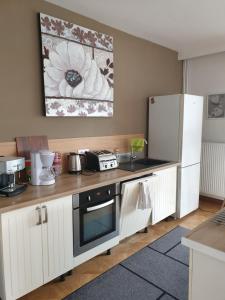 Zakwaterowanie obejmuje trzy sypialnie wyposażone łącznie w pięć łóżek oraz dwie łazienki z wanną i prysznicem. Aneks kuchenny jest nowocześnie wyposażony m.in. w zmywarkę, mikrofalówkę, piekarnik, płytę grzewczą, lodówkę, toster oraz ekspres do kawy i czajnik dla wygody gości.